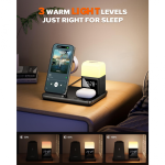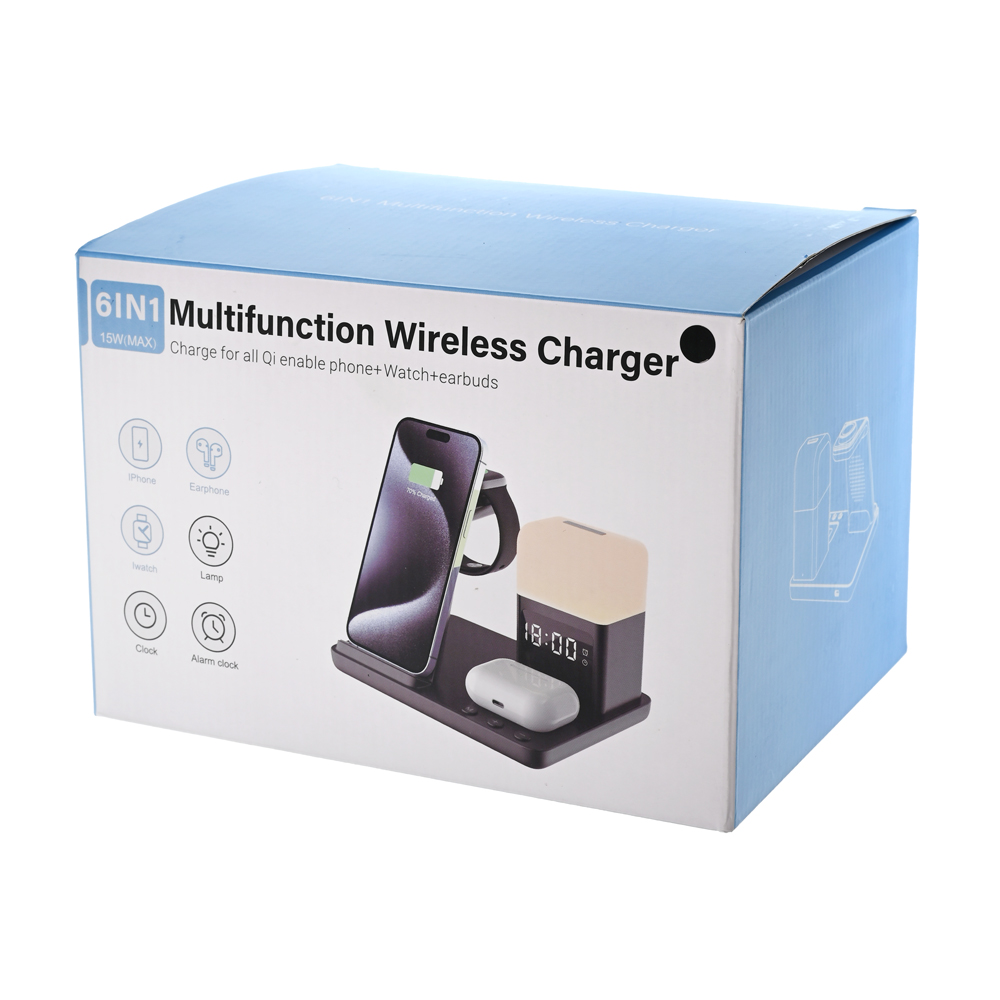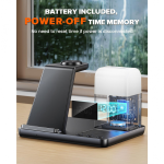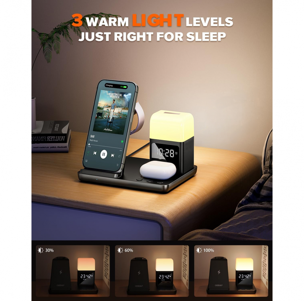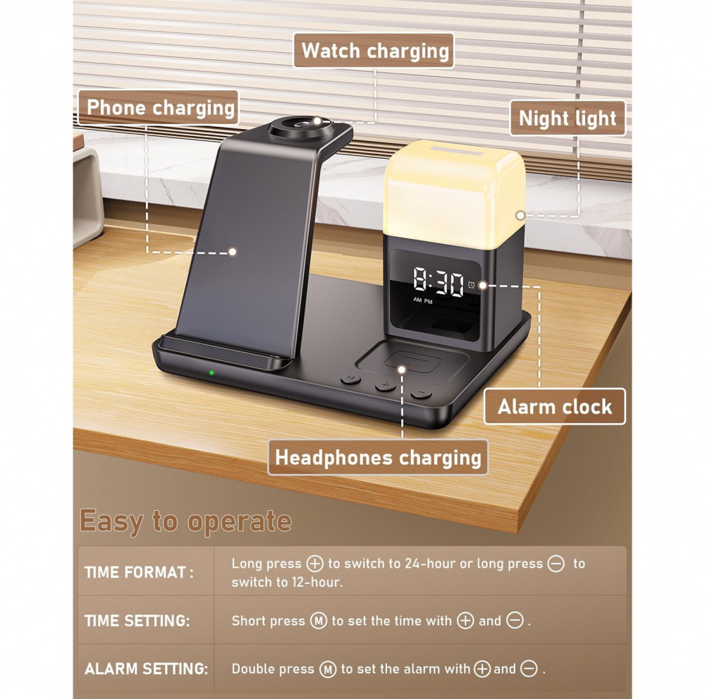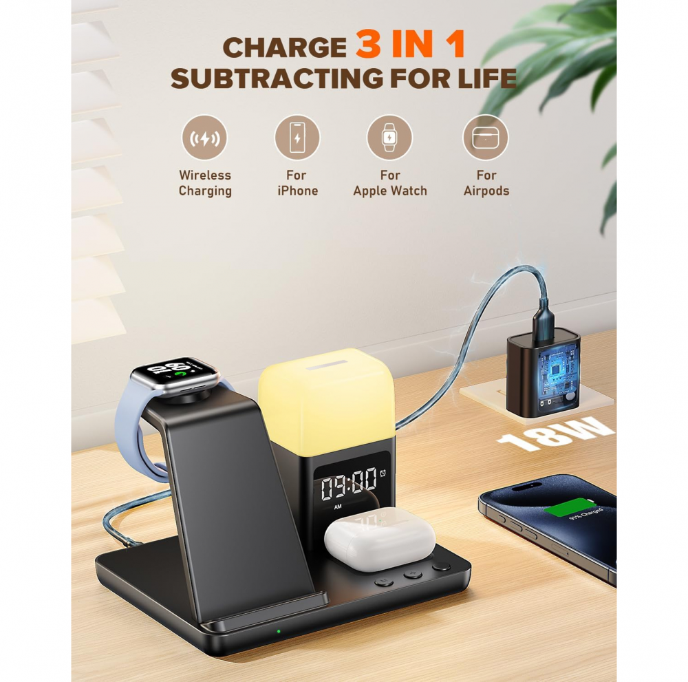 Bežična stanica za punjenje kombinuje bežični punjač, digitalni alarm sat i noćnu lampu sa tri režima osvetljenja. Omogućava istovremeno punjenje telefona, AirPods slušalica i Apple Watch sata, čime vaš radni sto ili noćni stočić ostaje uredan i bez gomile kablova.