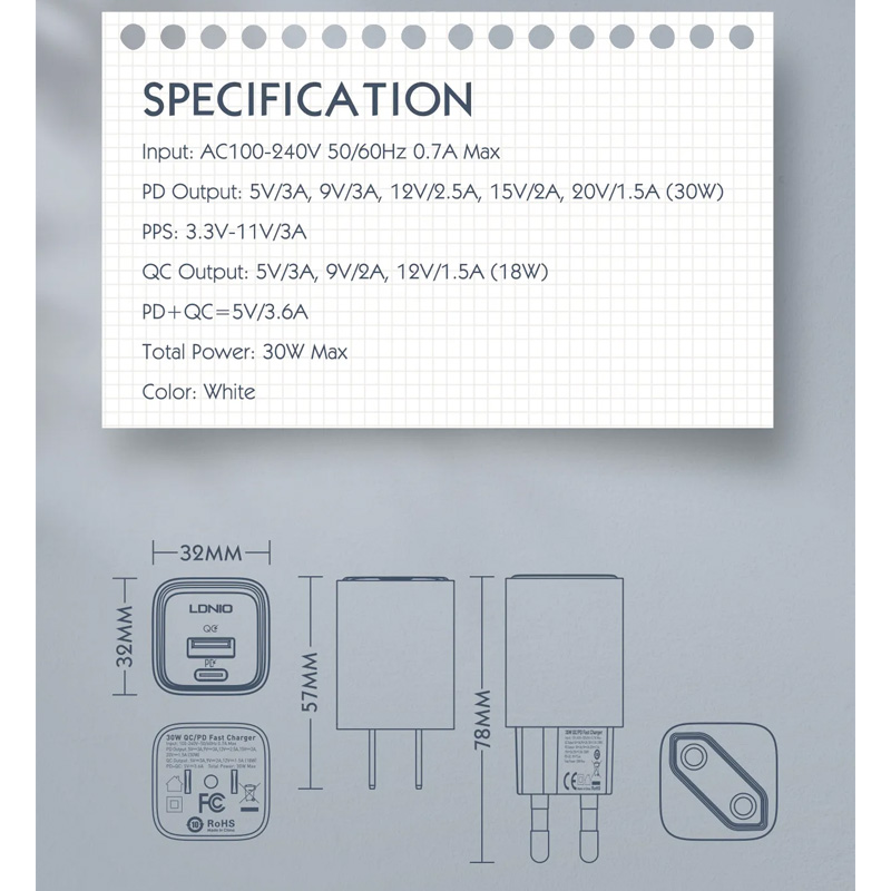 Kucni punjac LDNIO A2317C, 3.6A, QC3.0 18W, PD 30W sa Type C kablom beli